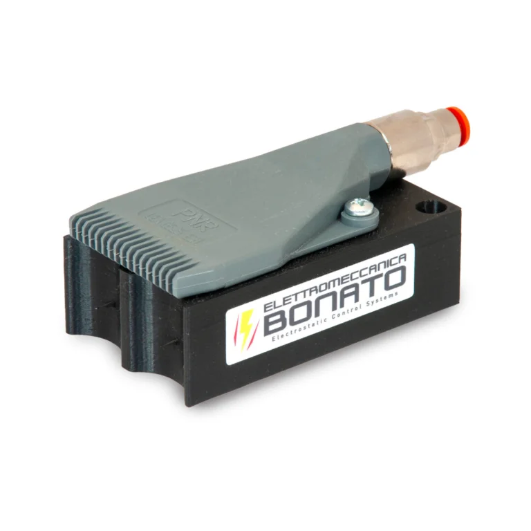 The ionizing head IH-DC-AN is an ionizing head having integrated 24Vdc power supply with a compressed air flat nozzle. Due to its compact design, it is ideal for use in all applications where space is limited. It does not require the use of an external power supply box, but it is ready for use only by means of an M8 power cable. It is equipped with an LED indicator that provides indications on the status of the device: Green= running, Red= fault, Blue flashing= standby, Violet= cleaning needed All electronic components are impregnated with epoxy resin so as to ensure safety and durability, with shock-resistant tungsten emitters connected to the high voltage via resistors.